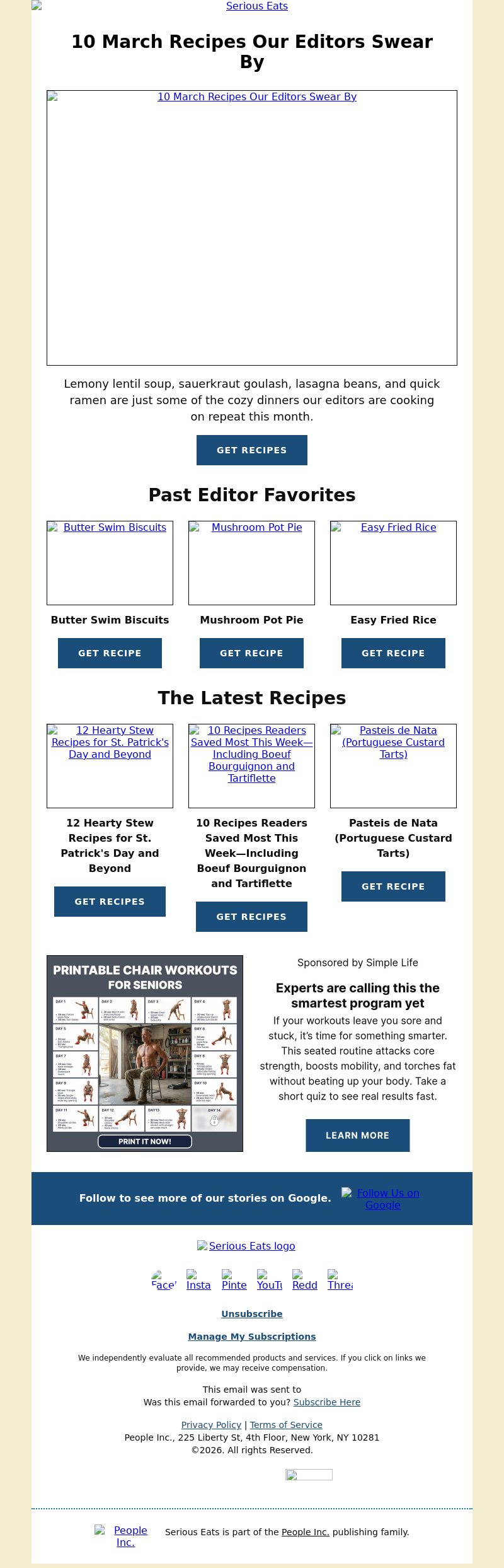 10 March Recipes Our Editors Swear By Lemony lentil soup, sauerkraut goulash, lasagna beans, and quick ramen are just some of the cozy dinners our editors are cooking on repeat this month. Get Recipes