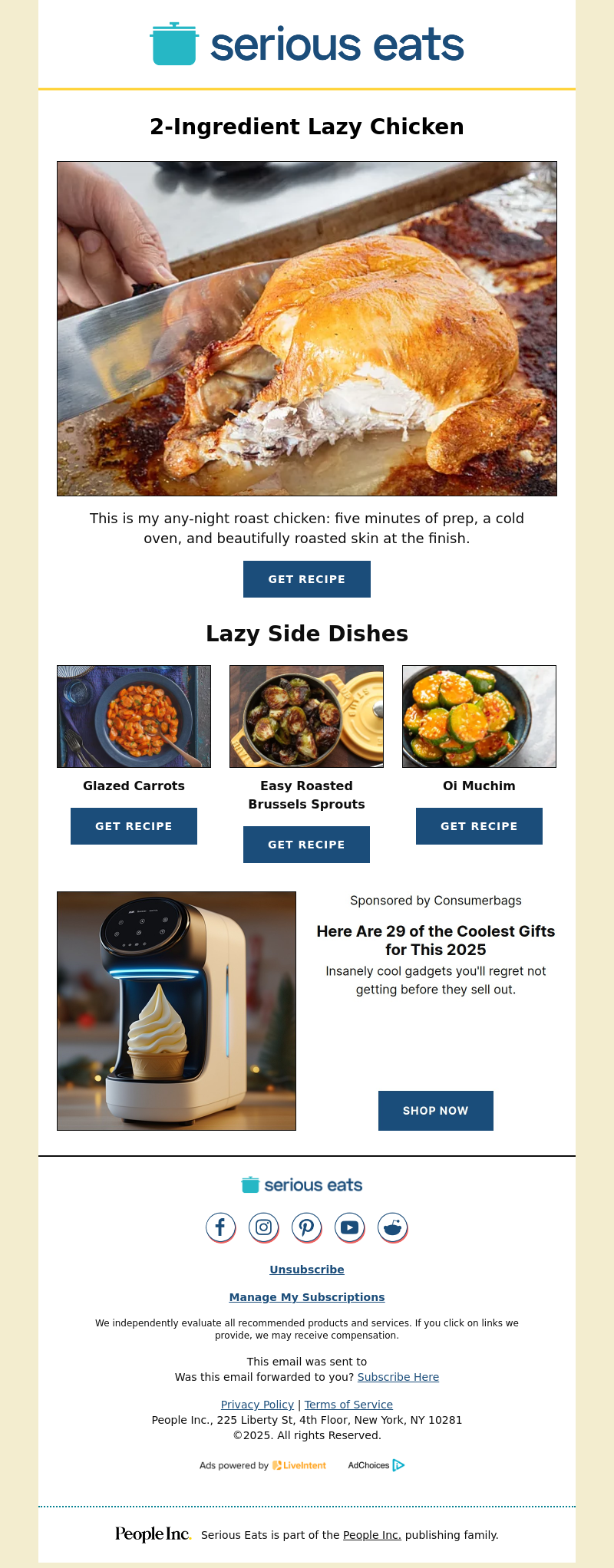 2-Ingredient Lazy Chicken This is my any-night roast chicken: five minutes of prep, a cold oven, and beautifully roasted skin at the finish. Get Recipe