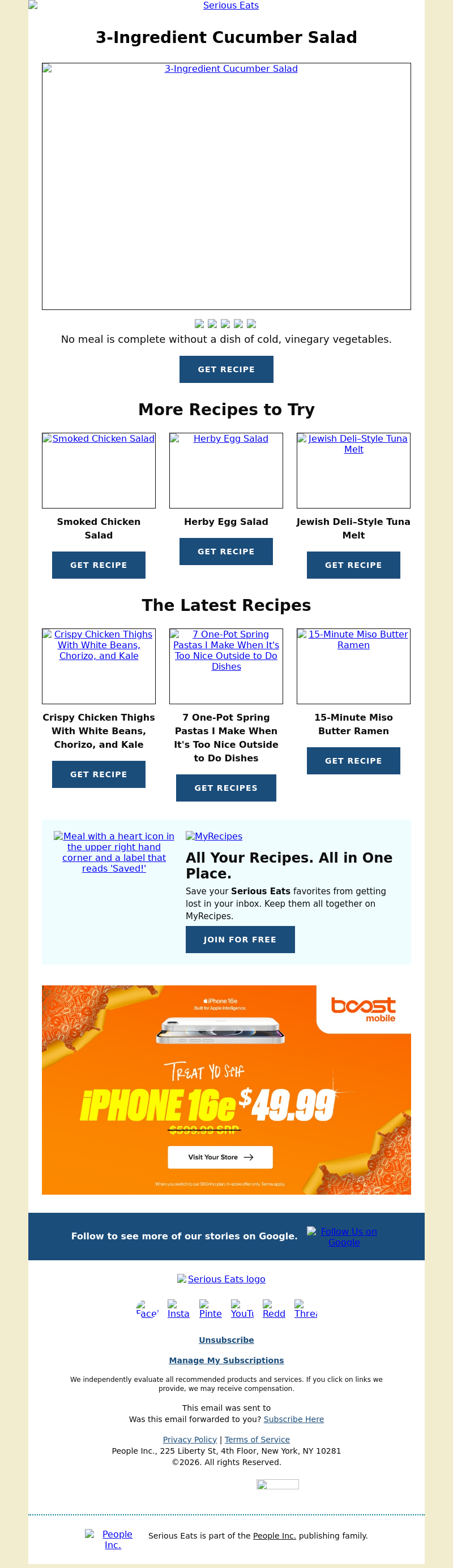 3-Ingredient Cucumber Salad No meal is complete without a dish of cold, vinegary vegetables. Get Recipe