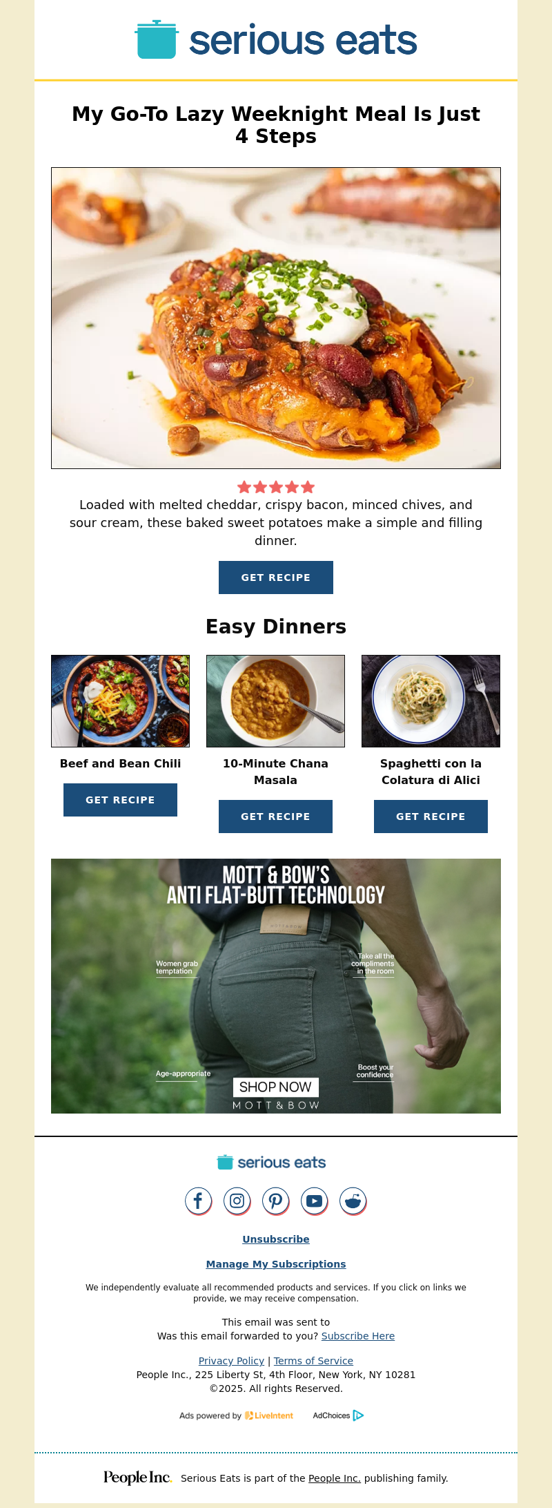 My Go-To Lazy Weeknight Meal Is Just 4 Steps Loaded with melted cheddar, crispy bacon, minced chives, and sour cream, these baked sweet potatoes make a simple and filling dinner. Get Recipe