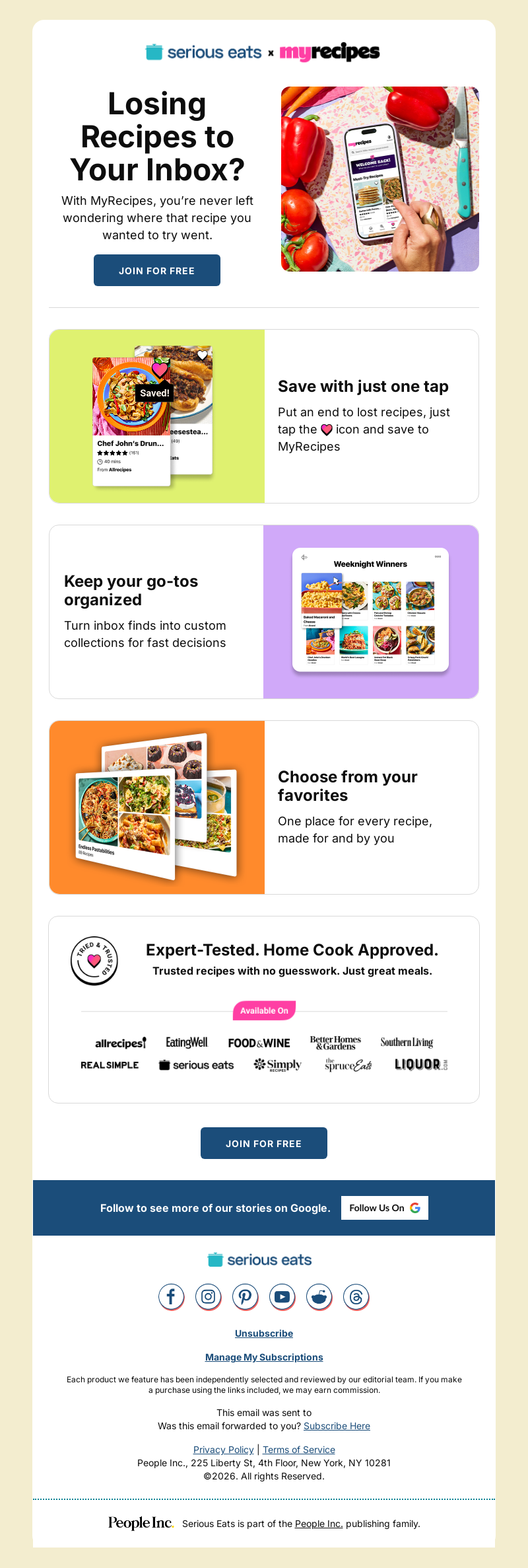 Losing Recipes to Your Inbox? With MyRecipes, you’re never left wondering where that recipe you wanted to try went. JOIN FOR FREE