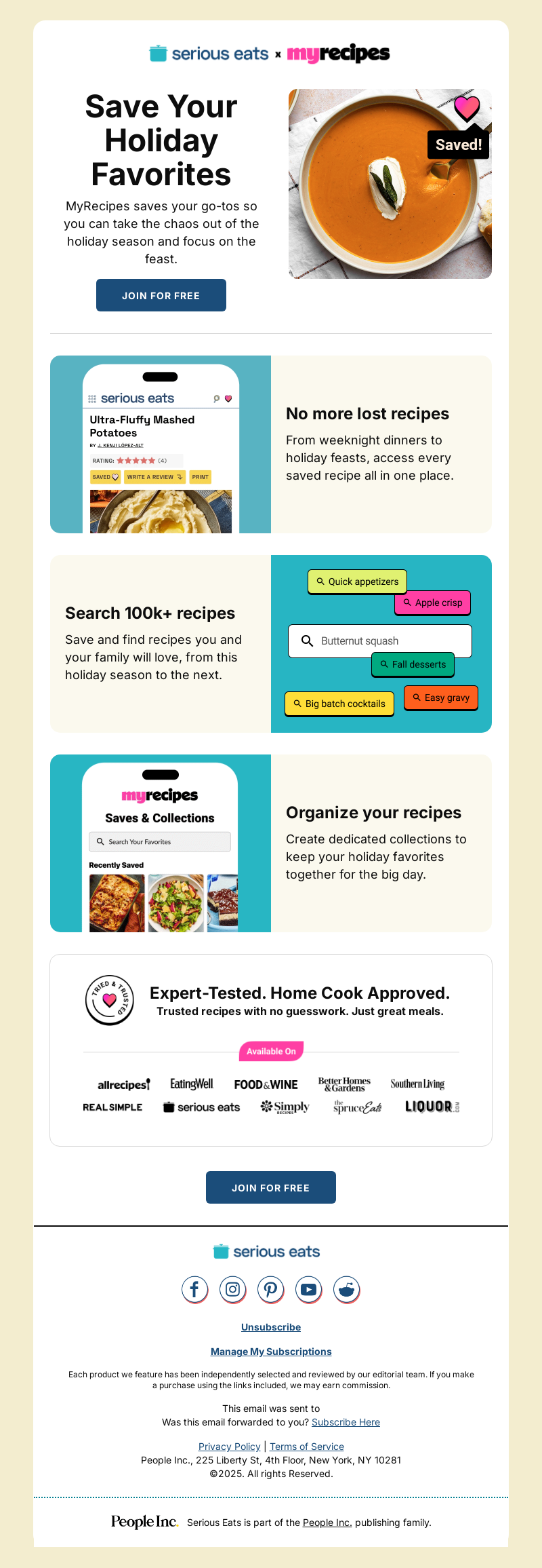Save Your Holiday Favorites MyRecipes saves your go-tos so you can take the chaos out of the holiday season and focus on the feast. JOIN FOR FREE