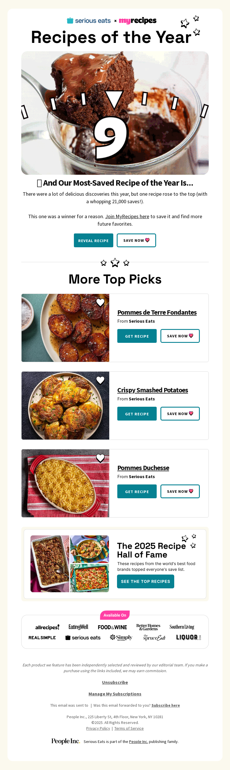 🥁 And Our Most-Saved Recipe of the Year Is... There were a lot of delicious discoveries this year, but one recipe rose to the top (with a whopping 21,000 saves!). This one was a winner for a reason. Join MyRecipes here to save it and find more future favorites. REVEAL RECIPE Save Now