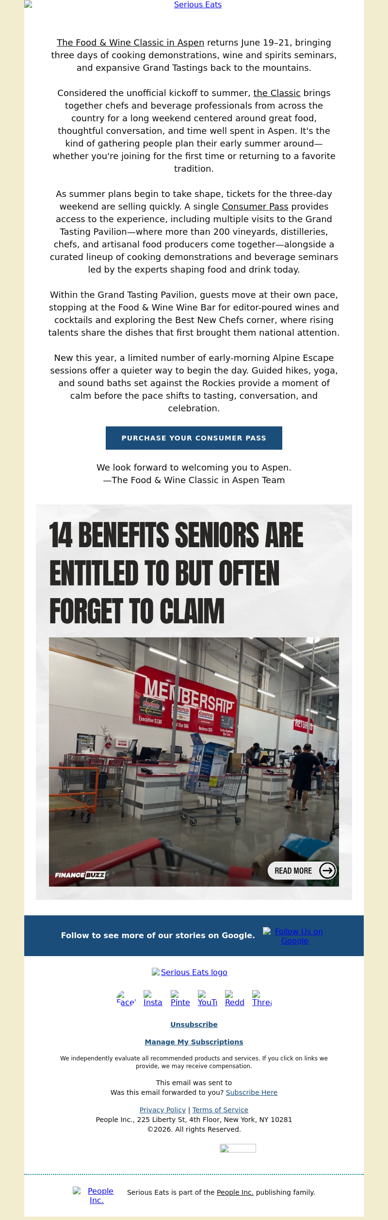 | Subject | The 2026 Food & Wine Classic in Aspen, June 19–21 |